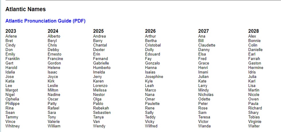 The WMO has a running list of 6 years worth of names, which cycle through every 6 years. Ex: The first Hurricane of 2024 in the Atlantic region will be named Alberto, and then again in 2030 the first Hurricane of 2030 will be named Alberto (of course so long as Alberto doesn’t pose a dangerous threat his first time, eliminating him from the list).