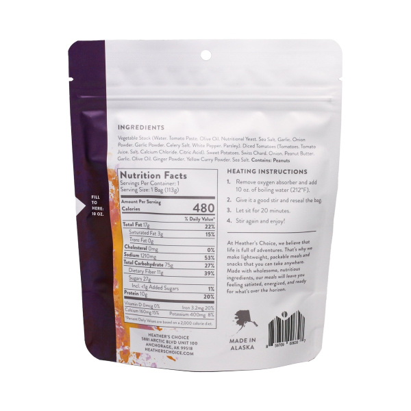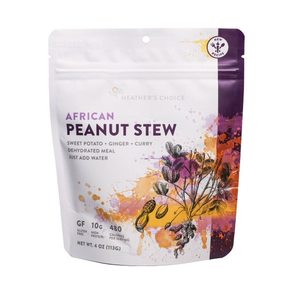 Do you crave vegetables while you are out on the trail? Then you will love the fresh chard in this ultralight backpacking meal alongside garlic, onions and diced sweet potatoes. Our dehydrated backpacking foods contain no artificial flavors, MSG, fillers, or preservatives. Enjoy an ultralight backcountry meal made with all real ingredients, no surprises. Heather’s Choice backcountry meals and snacks provide an allergen-safe backpacking food option for individuals with a variety of dietary restrictions. This African Peanut Stew is gluten, soy, egg, and dairy-free.