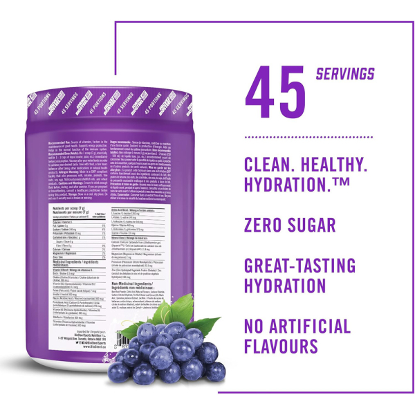 Vitamin B Blend Biotin 0.3 mcg, Choline (Choline Bitartrate) 300 mcg, Vitamin B12 (Cyanocobalamin) 0.3 mcg, Folate (Folic Acid) 7 mcg, Inositol 300 mcg, Niacin (Vitamin B3) 300 mcg, Pantothenic Acid (Calcium D-Pantothenate) 270 mcg, Vitamin B6 300 mcg, Riboflavin (Vitamin B2) 300 mcg, Thiamine (Vitamin B1) 300 mcg Amino Acid Blend L-Leucine 1202 mg, L-Valine 544 mg, L-Isoleucine 544 mg, Glycine 460 mg, L-Glutamine 973 mg, Taurine 135 mg Mineral Blend Calcium (Calcium Carbonate from Lithothamnion pp.) (Aquamin™) 11.8 mg, Magnesium (Magnesium Citrate) 2 mg, Potassium (Potassium Citrate Monohydrate) 32.5 mg, Zinc (Zinc Hydrolyzed Vegetable Protein Chelate) 160 mcg. Non-Medicinal Ingredients Beet Root Powder, Citric Acid, Natural Grape Flavour, Sodium Chloride, Sodium Citrate Dihydrate, Purified Stevia Leaf Extract, Spirulina platensis Extract, Lecithin. |
