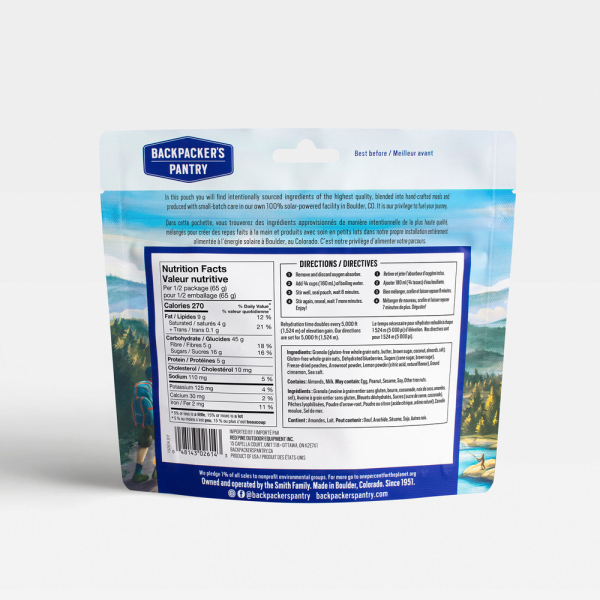 A delicious crisp to take on any adventure. Filled with sweet blueberries, juicy peaches and a buttery crisp finish with a hint of cinnamon. This southern classic will remind you of a home cooked crisp. Vegetarian, 2 servings per pouch.