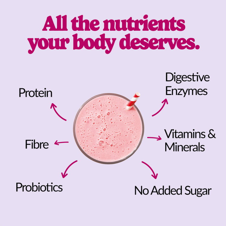 | Ingredients | Protein blend (pea protein, milled golden flaxseed), natural flavours, soluble tapioca fibers, coconut milk powder* (coconut milk powder*, tapioca maltodextrin*, acacia gum*), acacia gum, guar gum, xanthan gum, medium chain triglycerides (medium chain triglycerides from coconut oil, acacia gum), fruits, vegetables, and mushrooms blend (blueberry juice powder*, broccoli, spinach, kale, pumpkin, sweet potato, sunflower seed, cranberry, chlorella, maitake mushroom, shiitake mushroom, pomegranate juice powder*, acai juice powder*, goji juice powder*, grape juice powder*, amla fruit powder*, aronia powder*, sea buckthorn juice powder*, camu camu powder*, acerola juice powder*), rebaudioside M, citric acid, salt, beetroot colour, and bacterial culture and enzymes blend (rice maltodextrin, Bacillus subtilis, amylase, protease). *Organic ingredients. |