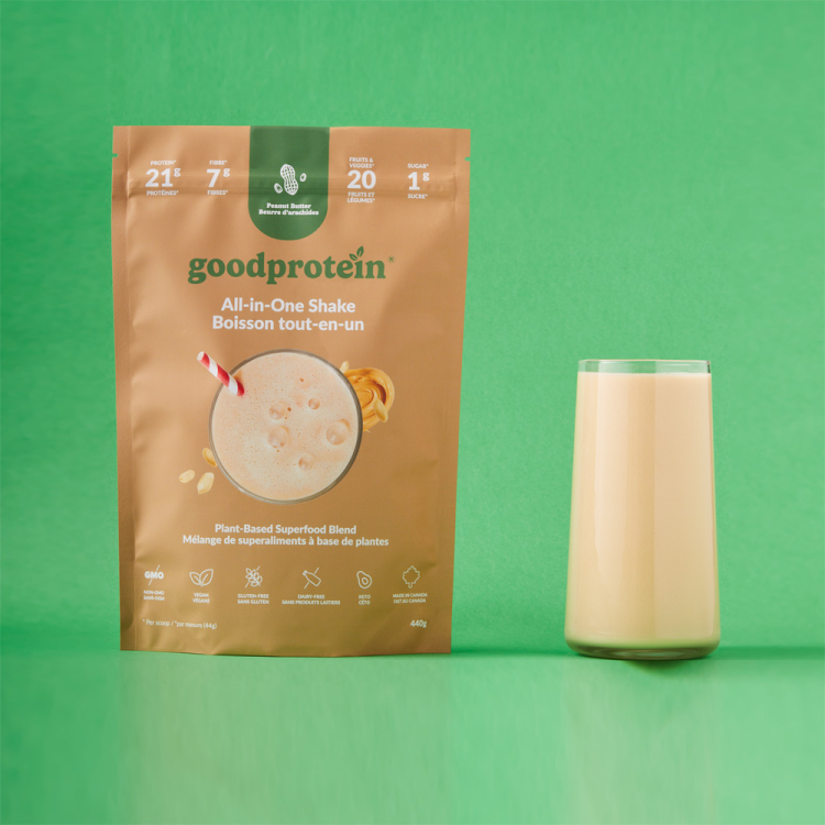 Ingredients | Protein blend (pea protein, milled golden flaxseed), Natural flavours, Soluble tapioca fibers, Peanut flour, Coconut milk powder* (coconut milk powder*, tapioca maltodextrin*, acacia gum*), Acacia gum, Guar gum, Xanthan gum, Medium chain triglycerides (medium chain triglycerides from coconut oil, acacia gum), Salt, Fruits, vegetables and mushrooms blend (broccoli, spinach, kale, pumpkin, sweet potato, sunflower seed, cranberry, chlorella, maitake mushroom, shiitake mushroom, pomegranate juice powder*, acai juice powder*, goji juice powder*, grape juice powder*, amla fruit powder*, aronia powder*, sea buckthorn juice powder*, camu camu powder*, acerola juice powder*), Rebaudioside M, Bacterial culture and enzymes blend (rice maltodextrin, Bacillus subtilis, amylase, protease). *Organic ingredients |