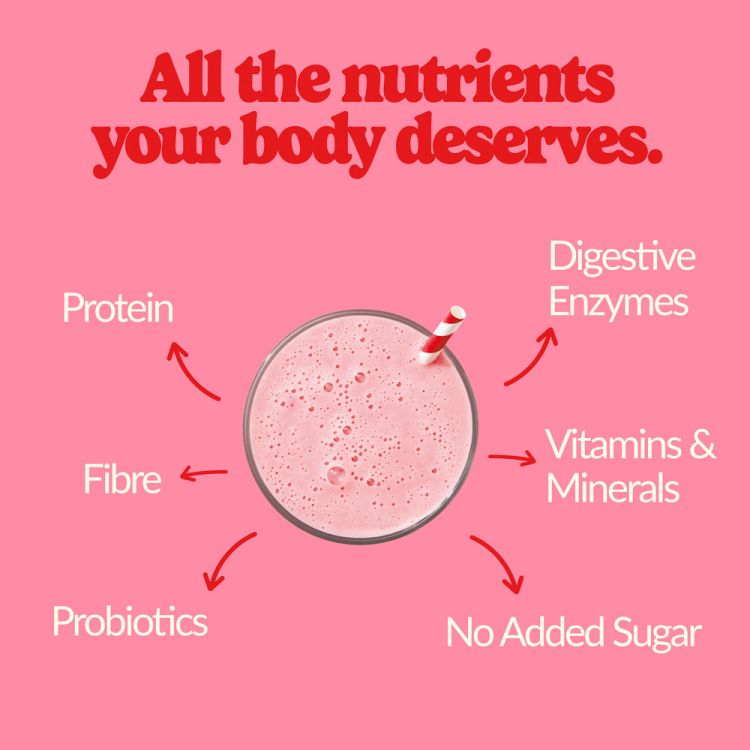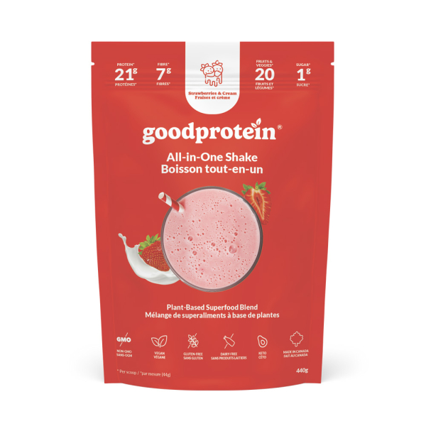 | Ingredients | Protein blend (pea protein, milled golden flaxseed), natural flavours, soluble tapioca fibers, coconut milk powder* (coconut milk powder*, tapioca maltodextrin*, acacia gum*), acacia gum, guar gum, xanthan gum, medium chain triglycerides (medium chain triglycerides from coconut oil, acacia gum), fruits, vegetables, and mushrooms blend (broccoli, spinach, kale, pumpkin, sweet potato, sunflower seed, cranberry, chlorella, maitake mushroom, shiitake mushroom, pomegranate juice powder*, acai juice powder*, goji juice powder*, grape juice powder*, amla fruit powder*, aronia powder*, sea buckthorn juice powder*, camu camu powder*, acerola juice powder*), beetroot colour, rebaudioside M, salt, citric acid, and bacterial culture and enzymes blend (rice maltodextrin, Bacillus subtilis, amylase, protease). *Organic ingredients. |