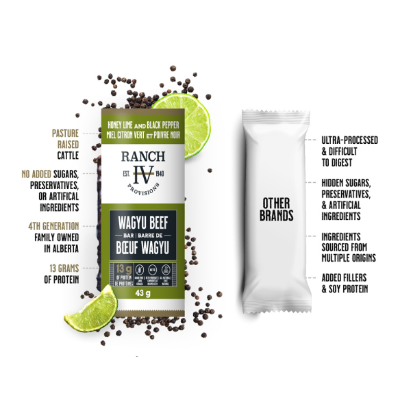 Spice things up with honey, lime, dates and cracked pepper in this premium Alberta Wagyu beef bar with 13 grams of all-natural protein. This bold flavoured bar gives you delicious, long lasting energy that will satisfy any time of day.