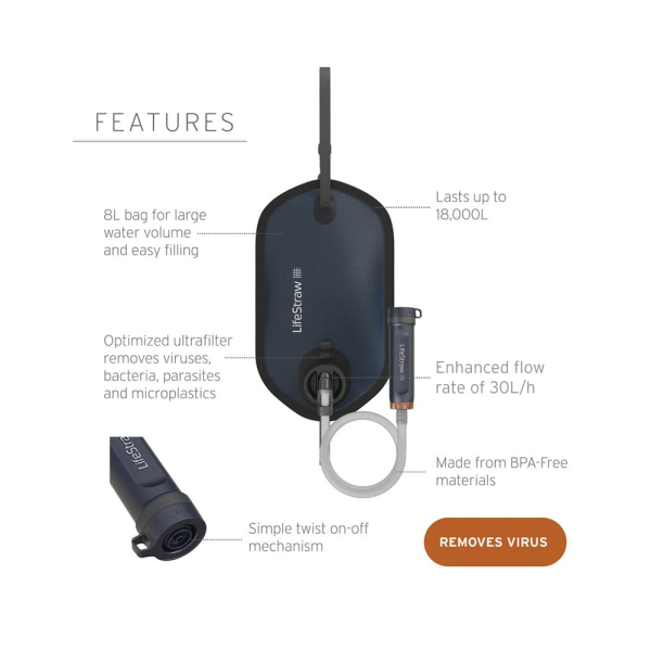 • Lifestraw Peak Rapid Flow Gravity Water Filter with Virus Removal includes an 8L gravity bag with carry strap and carabiner, 1.2m hose, Ultrafilter membrane, adapter to enable direct filling of water bottles with 28mm standard threading, prefilter basket, leakproof cap and backwash syringe user manual