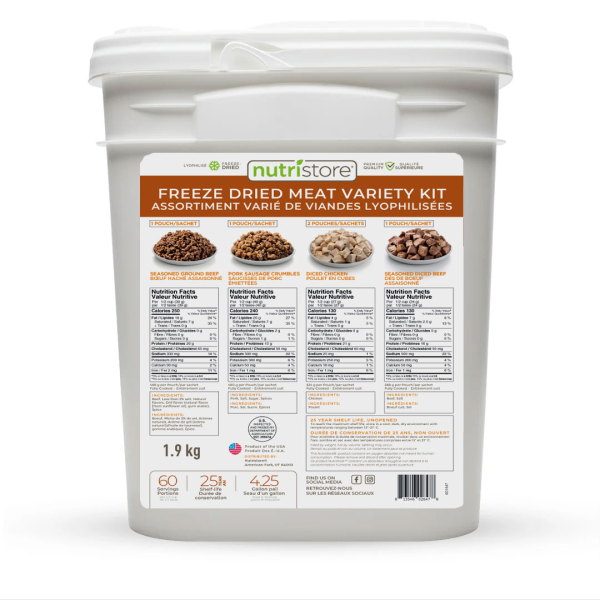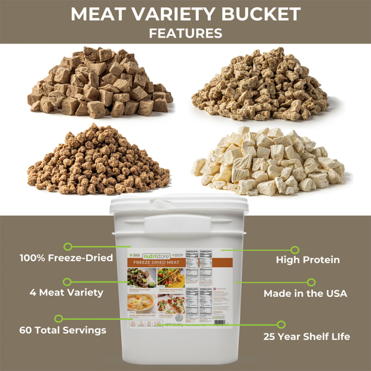 SAVE TIME! Whenever you need great tasting meat for the meal your making - and don't want to spend hours cooking - look to the Nutristore™ Freeze Dried Meat Variety Bucket. The perfect assortment of delicious and fully cooked ready to use meat. Each bucket provides 60 half cup servings including 12 servings of Diced Beef, 12 servings of Ground Beef, 12 servings of Sausage Crumbles and 24 servings of Diced Chicken. Just add to your meal and enjoy!