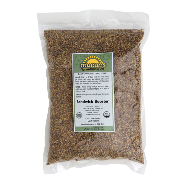 Sandwich Booster is a sprout mix of clover, alfalfa, radish, and mustard. It is an easy 5-day sprout that grows well in a jar or sprouting tray.