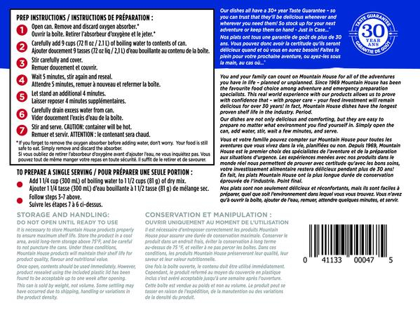 Do not open until you are ready to use. It is necessary to store Mountain House products properly to ensure maximum shelf life. Store the product in a cool area, avoid long-term storage above 72°F/22°C, and be careful to not puncture the cans. Under these conditions, Mountain House meals will maintain its shelf life for product quality, flavour and nutritional value. Once opened you can increase your shelf life by vacuum packing any unused portions or rehydrating all the product and freezing unused portions.