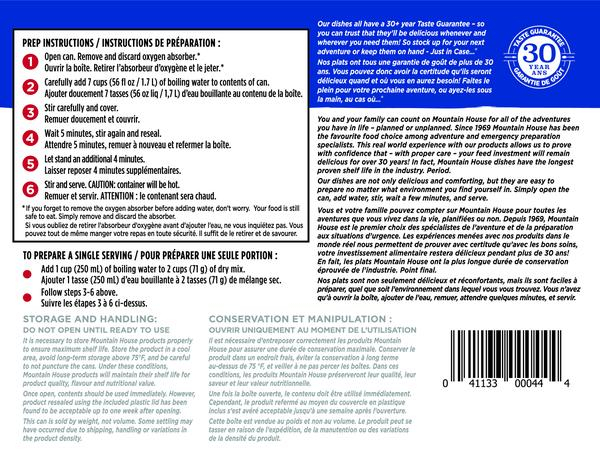 Do not open until you are ready to use. It is necessary to store Mountain House products properly to ensure maximum shelf life. Store the product in a cool area, avoid long-term storage above 72°F/22°C, and be careful to not puncture the cans. Under these conditions, Mountain House meals will maintain its shelf life for product quality, flavour and nutritional value. Once opened you can increase your shelf life by vacuum packing any unused portions or rehydrating all the product and freezing unused portions.