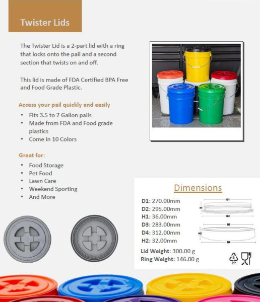 Upgrade your storage game with the silver HDPE Plastic Twister Lid, designed to fit standard 3.5 - 6 gallon round pails with a secure, twist-on seal. Made from FDA-compliant, BPA-free HDPE plastic, this rugged lid offers an airtight, moisture-resistant barrier ideal for storing emergency food, dry goods, pet food, and more. Its heavy-duty construction makes it the perfect companion for long-term food storage, outdoor adventures, or survival preparedness. No matter the circumstance, this lid provides dependable protection for your goods in any environment.