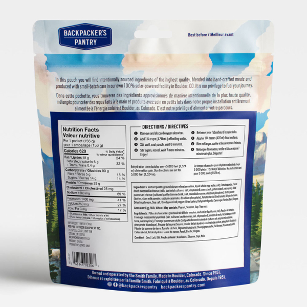 | Ingredients | Instant pasta (ground durum wheat semolina, liquid whole egg, water, salt), Tomato powder, Freeze-dried mozzarella cheese (milk, bacterial culture, salt, chymosin B, powdered cellulose), Dried parmesan cheese (partly skimmed milk, bacterial cultures, salt, microbial enzymes), Butter powder (butter, skim milk powder, sodium caseinate, disodium phosphate), Potato starch, Dried tomato, Dehydrated onion, Dried mushrooms, Sea salt, Dried green bell pepper, Dried celery, Dehydrated garlic, Cane sugar, Parsley, Basil, Oregano. |