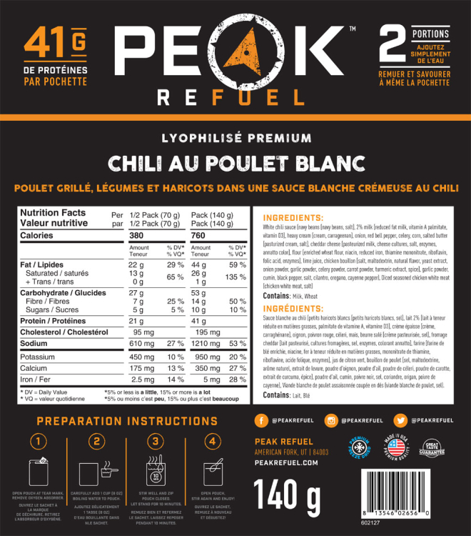 Ingredients | White chili sauce (navy beans [navy beans, salt], 2% milk [reduced fat milk, vitamin A palmitate, vitamin D3], heavy cream [cream, carrageenan], onion, red bell pepper, celery, corn, salted butter [pasturized cream, salt], cheddar cheese [pasteurized milk, cheese cultures, salt, enzymes, annatto color], flour [enriched wheat flour, niacin, reduced iron, thiamine mononitrate, riboflavin, folic acid, enzymes], lime juice, chicken bouillon [salt, maltodextrin, natural flavor, yeast extract, onion powder, garlic powder, celery powder, carrot powder, turmeric extract, spice], garlic powder, cumin, black pepper, salt, cilantro, oregano, cayenne pepper), Diced seasoned chicken white meat (chicken white meat, salt) |
